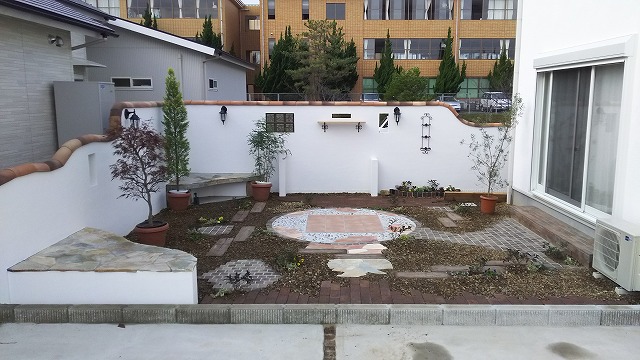社長の提案したいくつかのデザイン画をみた途端、それまで殆ど関心の無かったご主人も俄然乗り気に。「……絶対ここでやれ!てな感じでした」と笑うご主人お気に入りの庭は、アンティークなレンガで円形をアレンジしたデザイン。限られた敷地をより広く見せるよう工夫され、ヨーロッパの古い街並みを思い起こさせるようなレトロな雰囲気がお洒落な庭だ。